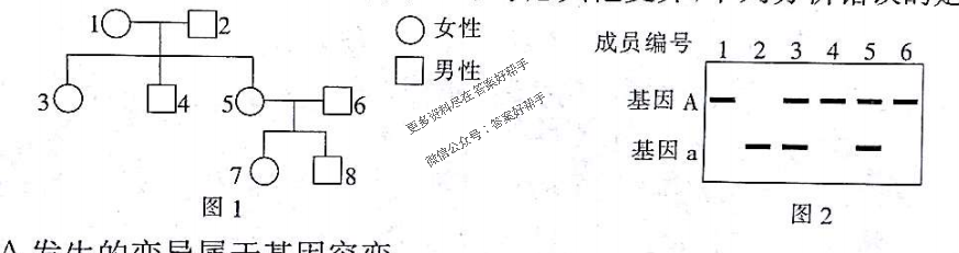 7.人类有一种隐性遗传病,其致病基因a是由基因A编码序列缺失部分碱基产生的。图1表示与该遗传病有关的某家系成员的关系,未标明患病个体。通过对该家系成员部分个体进行基因检测,得到的条带检测结果如图2所示。不考虑其他变异,下列分析错误的是