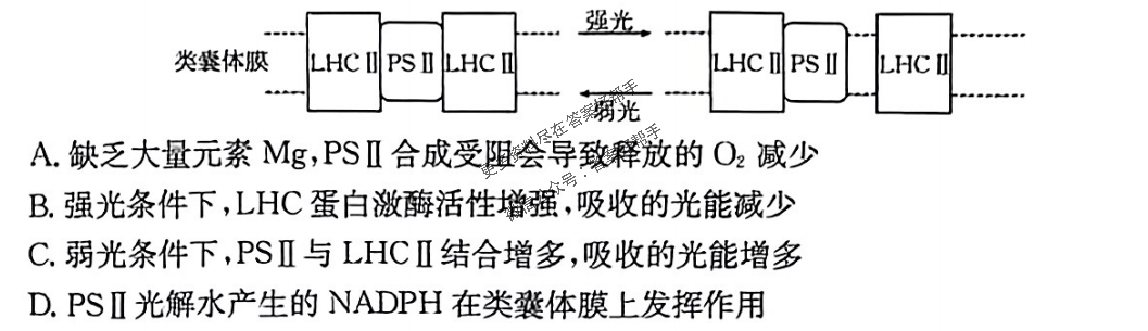 6.光反应依赖类囊体膜上的PSⅡ光复合体。PSⅡ光复合体含有光合色素,能吸收光能并光解水。PSⅡ光复合体上的蛋白质LHCⅡ通过与PSⅡ结合或分离来增强或减弱对光能的吸收,过程如图所示。LHCⅡ与PSⅡ的分离依赖LHC蛋白激酶的催化。下列叙述错误的是