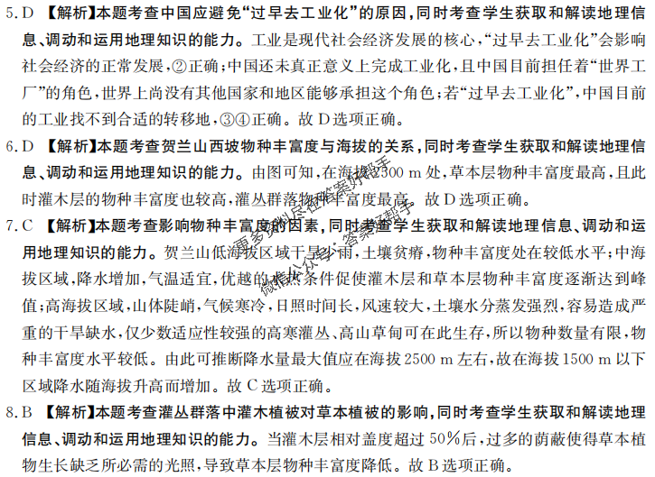 6.D 【解析】本题考查贺兰山西坡物种丰富度与海拔的关系,同时考查学生获取和解读地理信息、调动和运用地理知识的能力。由图可知,在海拔 2500 m处,草本层物种丰富度最高,且此时灌木层的物种丰富度也较高,灌从群落物种丰富度最高。故D选项正确。