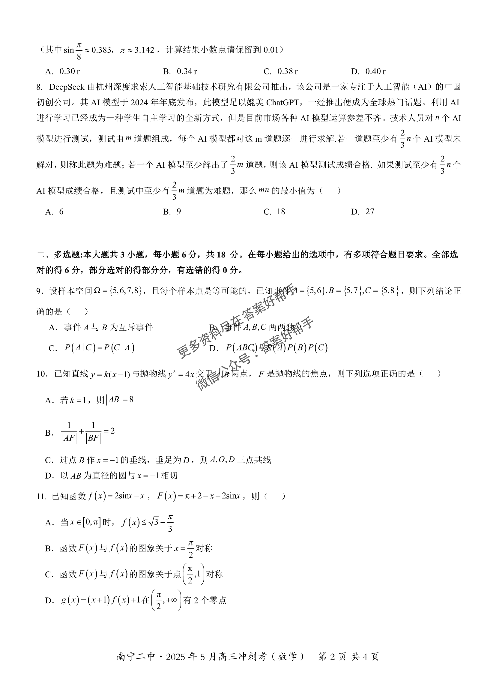 “莫等闲,白了少年头,空悲切!”—— 岳飞 青春稍纵即逝,别在该奋斗的年纪虚度。今日拼搏,是未来的底气;珍惜时光,才能书写无悔青春。向大家分享广西省南宁二中2025届高三5月冲刺考 数学试卷