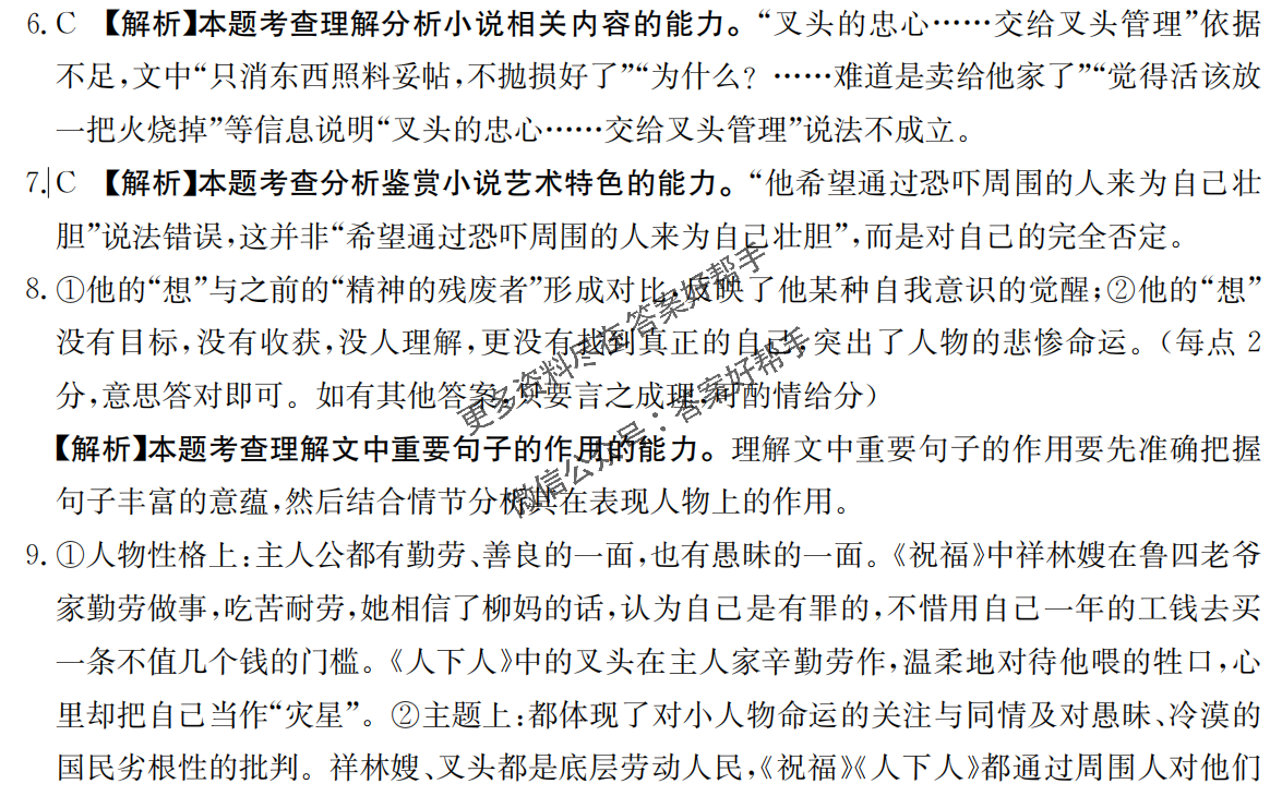 9.有人评价说师陀的文字有鲁迅“底色”,这篇小说与鲁迅的小说《祝福》有哪些相似之处?请从人物性格与主题上举例分析。(6分)