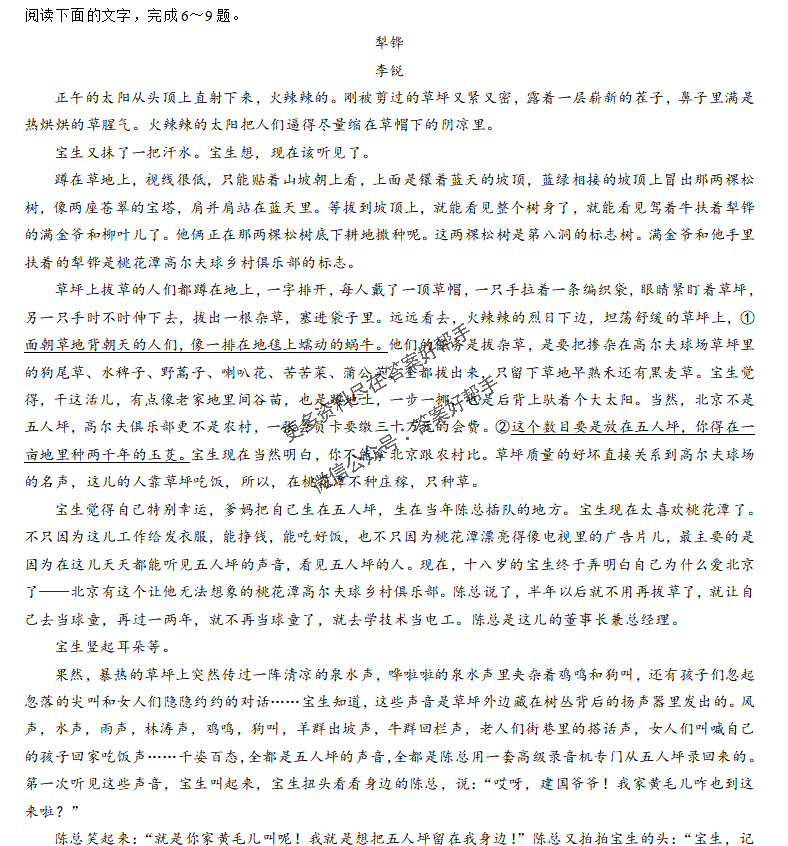 9.语文课上老师组织同学们针对这篇小说写一则文学短评。以下是参考题目:(1)“农具的寓言,冷峻的反思”:(2)“传统文明的当下命运”,请任选其一,围绕题目,立足文本内容,写出你的短评思路。(6分)