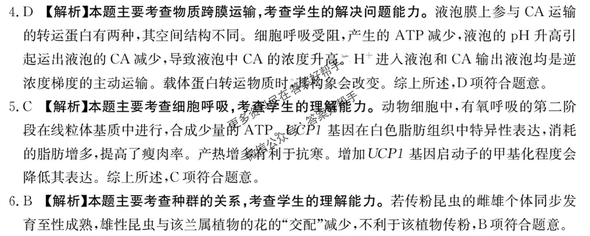 4.D 【解析】本题主要考查物质跨膜运输,考查学生的解决问题能力。液泡膜上参与CA运输的转运蛋白有两种,其空间结构不同。细胞呼吸受阻,产生的ATP减少,液泡的pH升高引起运出液泡的CA减少,导致液泡中CA的浓度升高。H+进入液泡和CA输出液泡均是逆浓度梯度的主动运输。载体蛋白转运物质时,其构象会改变。综上所述,D项符合题意。