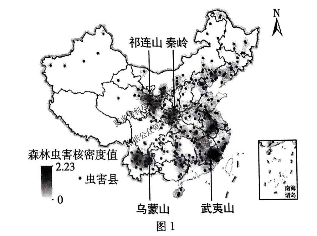 森林虫害发生与气象条件、树种和林分结构、人类活动等因素密切相关。图1为我国森林虫害核密度空间分布图,核密度值越大,森林虫害发生频次越高。据此完成 3~4 题。