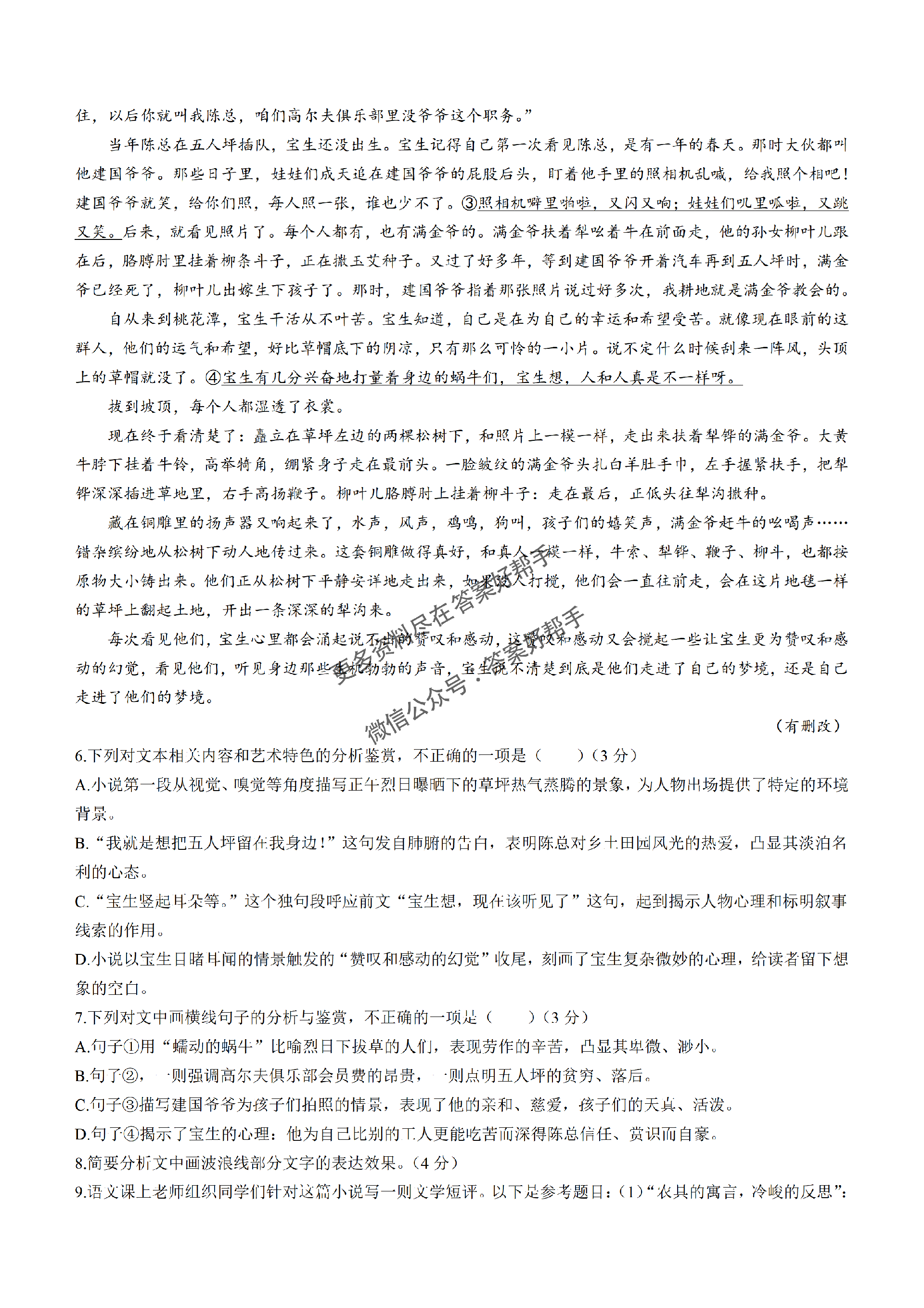 9.语文课上老师组织同学们针对这篇小说写一则文学短评。以下是参考题目:(1)“农具的寓言,冷峻的反思”:(2)“传统文明的当下命运”,请任选其一,围绕题目,立足文本内容,写出你的短评思路。(6分)